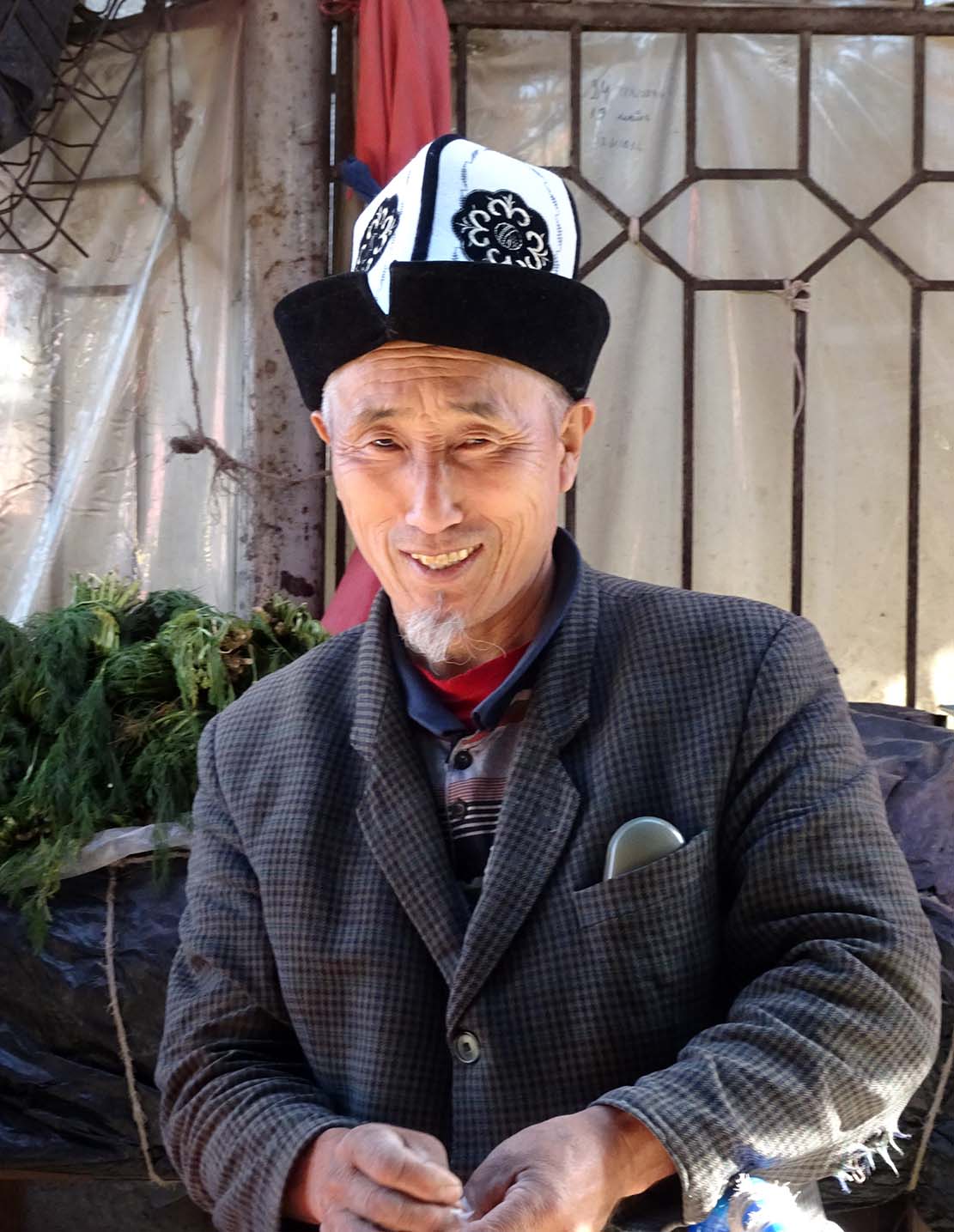Nous partons visiter et dessiner le grand marché d'Och. Immense construction de bric et de broc, couverte par endroits. Les secteurs sont bien déterminés, légumes, fruits frais ou secs, viande, fromages et produits laitiers, vêtements. Iroda essaie des chapeaux et j'achète un Kalpak traditionnel. Il est en feutre (bien sûr, c'est LA matière première ici) assez haut, ses bords sont retournés (ou pas) et il porte un motif Kirghize. Ce sont surtout les hommes des campagnes qui les portent.